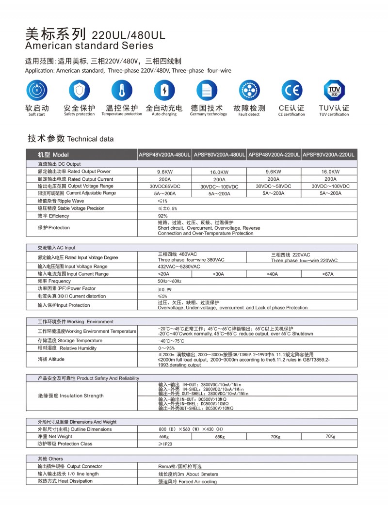 觸摸屏智能操作設計:告別傳統按鍵方式,給您帶來更現代更具科技智能的操作體驗 自動充電:插槍自動充電,簡化充電流程,便于操作 兼容性高:80V200A兼容48V200A充電 多重保護: 輸出短路,過流過壓保護,反接保護,電流導管保護等多重保護 預約充電功能:避開高峰用電時段,有效節省成本 雙語切換:中英文雙語隨需切換,跨越語言障礙,與世界接軌 人性化設計:充電機背板內部附部件明細及產品接線圖,方便客戶可更清楚的了解產品,便于維修,提高售后時效 獨特設計: 內置電磁鎖驅動模塊,防止臨時斷電鎖槍 使用壽命更長:功率模塊預留20%空間,提高模塊的使用壽命 出色內部結構: 內部結構左右出風,內部電路不容易積粉塵,提高充電機壽命
