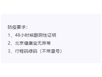 1、48小時(shí)核酸陰性證明;2、北京健康寶無(wú)異常;3、行程碼綠碼(不帶星號(hào))