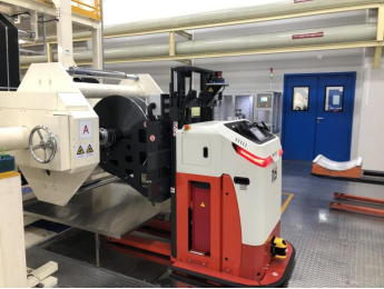 其次,針對極卷搬運及上下料的中段工藝應用場景,佳順智能開發了兩款采用激光SLAM導航的專用單叉/雙叉臂舉升AGV,最大負載可達1.8T,結合激光測距和二維碼技術進行精確定位,擁有360°避障雷達、急停按鈕、機械防撞機構、聲光報警等多種避障功能,實現生產安全、穩定運行。