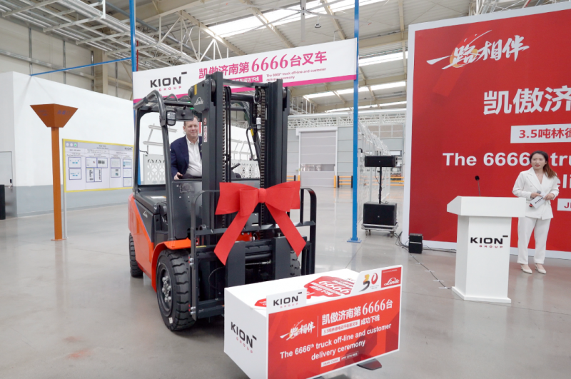 2023年4月13日,一路相伴暨凱傲濟南工廠第6666臺林德3.5噸電動平衡重叉車下線儀式在濟南萊蕪智慧工廠盛大舉行。凱傲集團首席執行官Rob Smith、凱傲集團董事兼凱傲亞太及美洲區總裁郭進鵬、凱傲集團執行董事會成員及凱傲中國管理層海爾集團客戶方代表、媒體嘉賓等出席本次活動,共同見證這歷史性時刻。