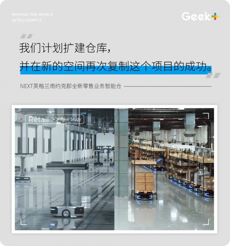 NEXT駐場經(jīng)理Liam Jenkinson表示:“與極智嘉的合作給我們帶來了非常積極的體驗,不論是從一開始還是后續(xù)持續(xù)的支持過程中。極智嘉的揀選和分揀系統(tǒng)提供的靈活性對我們的運營至關重要,而我們的倉庫管理系統(tǒng)與極智嘉的機器人管理系統(tǒng)之間的整合也非常順暢。隨著我們業(yè)務的不斷拓展,我們計劃擴建倉庫,并考慮在新的空間再次復制這個項目的成功。”