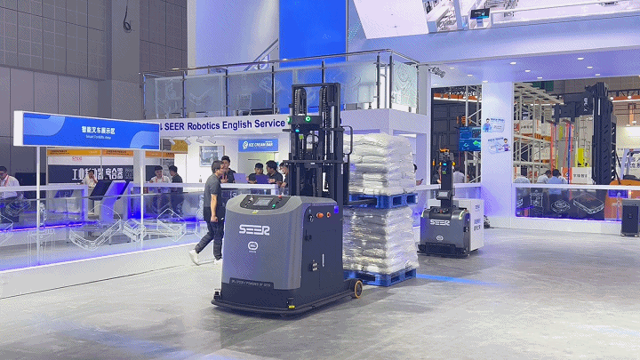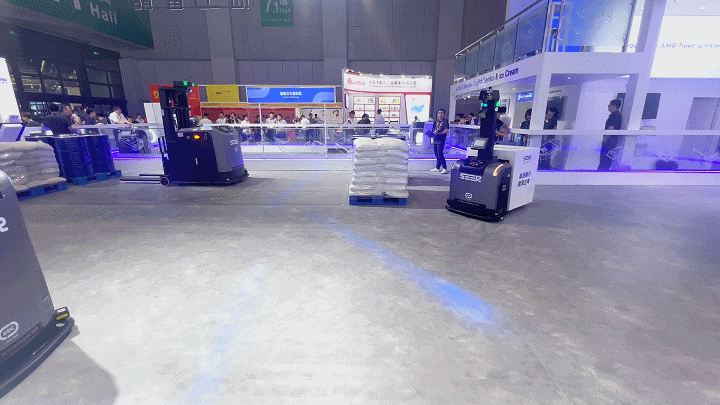 兩款今年新上市的智能叉車 SFL-CBD15 和 SFL-CDD16 在同一展區內協同作業,互為運行障礙物。兩車在保持最快 2m/s 的運行速度下依舊完美多次避讓,在避障激光、3D 避障相機、距離傳感器等多種傳感器的保護下實現高速暢行,順滑過彎,精準避障,靈活繞行。