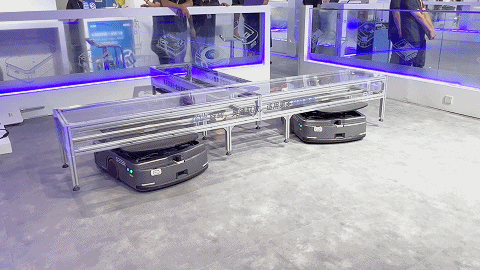 激光 SLAM 旋轉頂升搬運機器人 SJV-SW600 作為最具性價比的新款機器人,前后配備雙激光,定位精度可達 ±5mm,并支持頂升隨動功能。現場三臺 SJV-SW600 通過 Roboshop Pro 完成車體部署,基于 RDS 實現多車統一調度,對 T 字形托盤進行完美協作搬運,三機同時頂升轉圈,盡顯絲滑流暢。