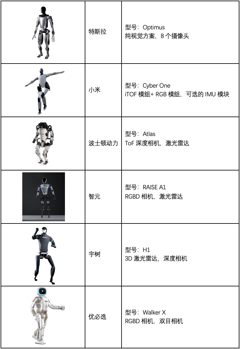 市面上主流的人形機器人通常配備先進的機器視覺系統,結合多模態感知能力和AI算法,實現環境理解、任務執行、安全和避障等功能。以特斯拉的Optimus人形機器人為例,它搭載8個攝像頭的純視覺方案,通過算法處理圖像,實現物體識別、環境理解等功能。而其他機器人,如小米的Cyber One、波士頓動力的Atlas、智元的RAISE A1、宇樹的H1以及優必選的Walker X,通過3D視覺和其他傳感器結合,實現對環境的感知功能。