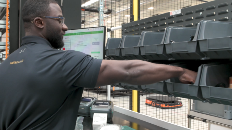 Farsound倉庫投入使用 “貨到人” 解決方案,布置了650個可移動貨架和8個揀選站。同時,設(shè)置指示燈和PTL分撥墻引導(dǎo)員工作業(yè),確保揀選、投放準(zhǔn)確。該方案釋放了32,000個料箱的額外存儲空間,提升了場地空間利用率。
