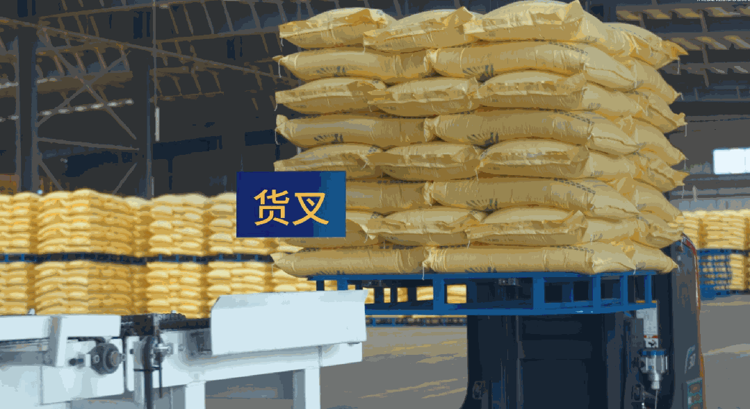 在其化肥生產(chǎn)制造車間的成品下線環(huán)節(jié),目前仍采用傳統(tǒng)人工叉車來完成搬運任務,加之成品倉儲采用的是軟包堆疊的方式,且單垛貨物較重,直接給項目增加了一層難度: