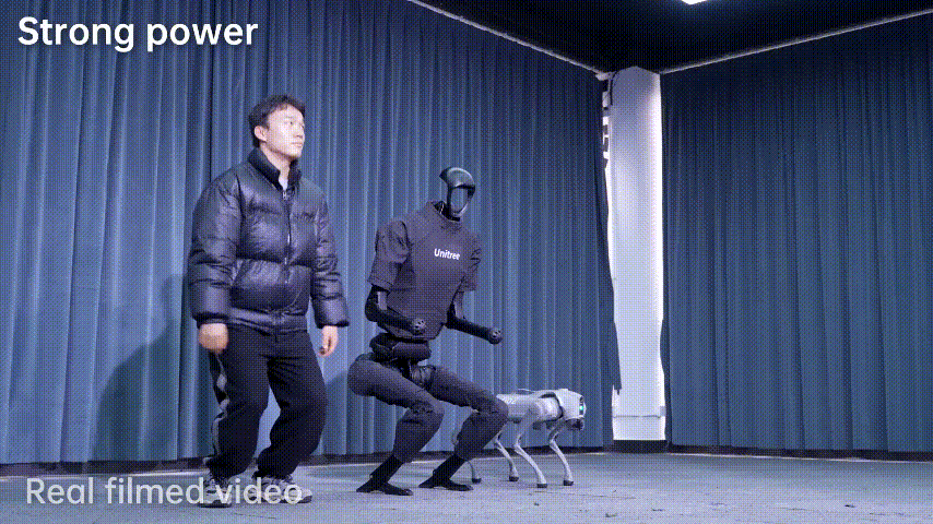 此外,Unitree H1 3.0首次具備雙腳原地跳躍能力,從視頻拍攝角度來看(近地面視角),以Unitree Go2四足機(jī)器人(高度40cm)為參照,Unitree H1 3.0的跳躍高度約為20-30cm。雙腳原地跳躍主要檢驗(yàn)了電機(jī)關(guān)節(jié)的高爆發(fā)力以及算法的穩(wěn)定性。