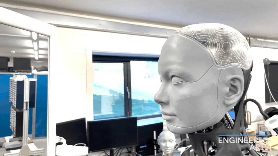 如今,Ameca 不僅能像人一樣控制表情,還有了畫畫、空間識(shí)別、語音克隆等 AI 賦予的能力。