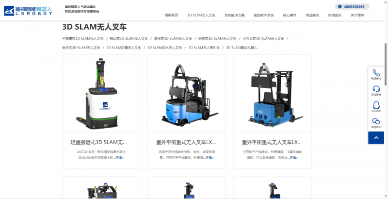 官網精心設計了3D SLAM無人叉車系列產品矩陣展示區,從輕量搬運式到前移式,再到室外平衡重式無人叉車,全方位覆蓋不同行業、不同場景的需求。