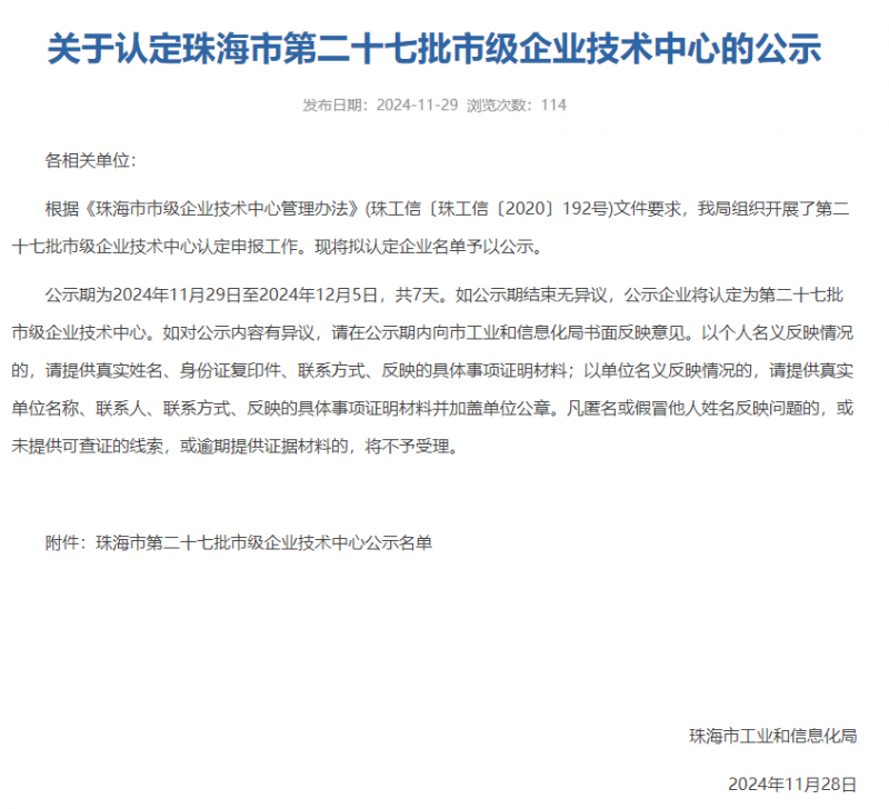 2024年11月29日,珠海市工業(yè)和信息化局發(fā)布了《關(guān)于認定珠海市第二十七批市級企業(yè)技術(shù)中心的公示》,廣東泰坦智能動力有限公司成功入選“珠海市第二十七批市級企業(yè)技術(shù)中心”,此次入選不僅是對公司過去努力的肯定,更是對未來發(fā)展的期許。