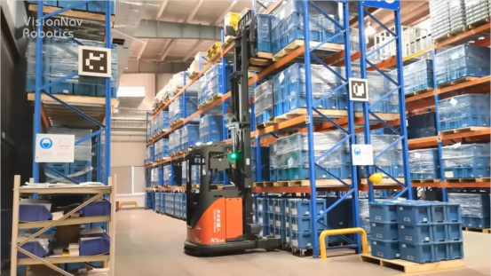 未來機器人前移式無人叉車最大舉升為9.4米,叉臂根部安裝了感知模塊,可以對橫梁狀況、庫位占用情況進行安全檢測,為后續(xù)入庫作業(yè)提供信息輸入。且具備自適應(yīng)模塊,可以很好地滿足多次重復(fù)精準叉取需求,提高作業(yè)的安全系數(shù)。同時其機器人管理系統(tǒng)可以對接自動門,當無人叉車行駛到卷閘門附近時,系統(tǒng)提前發(fā)出指令到卷閘門,節(jié)省了人工操作的時間,保障物流通暢。