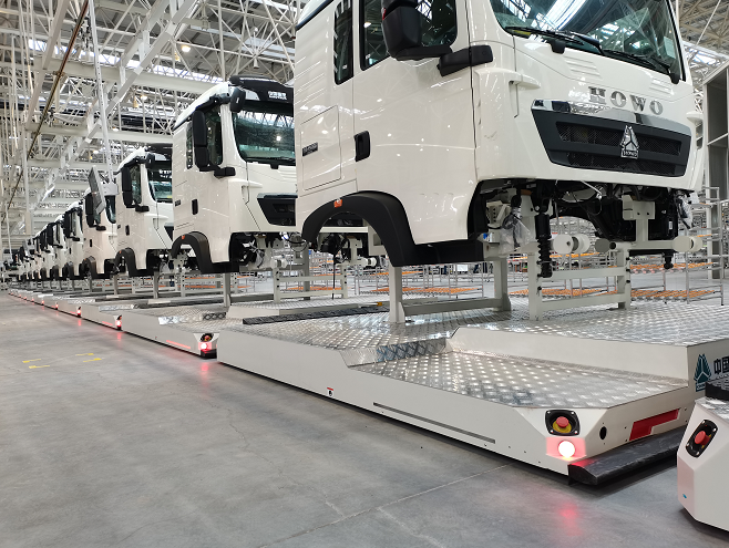 臨工智科為某重型汽車廠打造的全新智能工廠,其總裝車間全部采用AGV作為裝配和物流轉(zhuǎn)運的載體,實現(xiàn)了工位作業(yè)空間的最大化,是一座集柔性化”、“智能化”、“共享化”、“信息化”于一體的現(xiàn)代化車間。