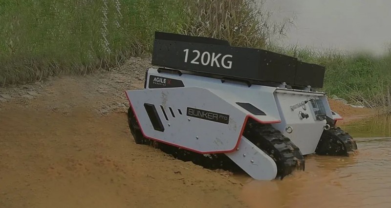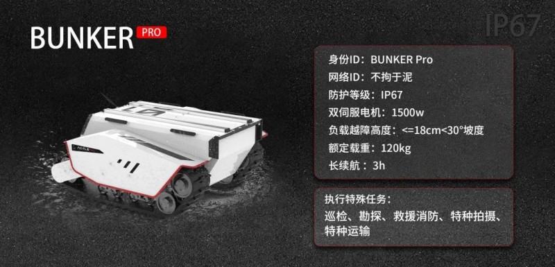 可以說,BUNKER Pro提供了在野外、箱涵、石泥路等高挑戰(zhàn)性環(huán)境下最佳的移動開發(fā)平臺,助力機器人行業(yè)和科研客戶快速部署和開發(fā)特殊作業(yè)機器人,諸如巡檢、勘探、消防、特種拍攝、特種運輸?shù)葢谩?/section>BUNKER Pro外觀結構全新設計,車身重心位置低,裝置了1500W雙伺服電機進行驅動,極具越野性。此外,其采用了克里斯蒂懸掛和瑪?shù)贍栠_四輪平衡多懸掛系統(tǒng)組合,并于全車安裝了加強版避震器和防撞擊結構組件,外觀采用了高強度和大厚度的鋼材,這為執(zhí)行特種作業(yè)應用提供了可靠的減震系統(tǒng)性能。 目前,BUNKER Pro最高越障可達18cm,爬坡度為<=30°,這意味著面對野外坡道和廠區(qū)樓梯,BUNKER Pro都可以一舉輕松爬越和穩(wěn)定運行。BUNKER Pro驅動形式為履帶差速轉向和左右獨立驅動,自研運動控制系統(tǒng)電機采用了2500線光電增量式碼盤,可以在復雜道路中實現(xiàn)高精度的控制,并且可以柔性實現(xiàn)0轉彎半徑原地自旋。BUNKER Pro外觀配置了防撞耐用的鋼質(zhì)結構, 且整車結構、材料以及外置電氣元件均采用均采用高防護等級設計,達到了IP67安全標準,這是市面上同級別綜合路況移動平臺中防護等級最高的。其具備沙塵滲透防護、移動涉水和短暫浸泡防護(防浸)等優(yōu)勢,無懼任何潮濕、涉水、越野等極限工作環(huán)境,可以保證BUNER Pro極大拓展機器人的使用場景。基于高等級防護、模塊化和精簡部件結構設計,BUNKER Pro車體后期清潔也是十分便捷的,不藏污垢,不易腐蝕,易于維護。BUNKER Pro平臺空間大,可以在原地自旋過程中達到120kg載重,這意味著可以輕松搭載各類檢測設備。用戶可通過CAN總線協(xié)議與主控通訊,快速接入傳感系統(tǒng),搭建自主應用開發(fā)平臺,同時,BUNKER Pro也支持定制高級操作模式(遠程駕駛/自動駕駛),提供開源SDK、ROS_PACKAGE。BUNKER Pro還具有大電池容量,可在常規(guī)路面載重120kg運行情況下支持3小時續(xù)航, 也可對搭載的傳感器等外部設備進行供電, 為機器人應用的作業(yè)提供充足和便捷的運行保障。