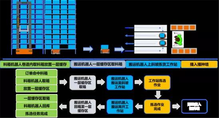 “大工”鴻鵠料箱機(jī)器人主要干“蓋樓”的活,系統(tǒng)下達(dá)命令后,鴻鵠負(fù)責(zé)垂直方向的取貨,然后放在一層的緩存架;接下來(lái),由體積小巧靈活的“小工”青鸞干“搬磚”的活,負(fù)責(zé)水平方向上遠(yuǎn)距離的料箱搬運(yùn),背負(fù)料箱送至工作站。人只需要從料箱內(nèi)揀貨即可。