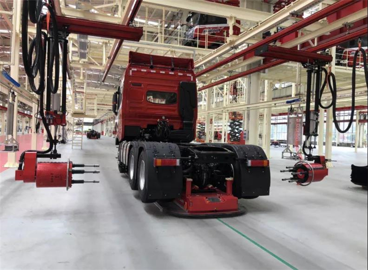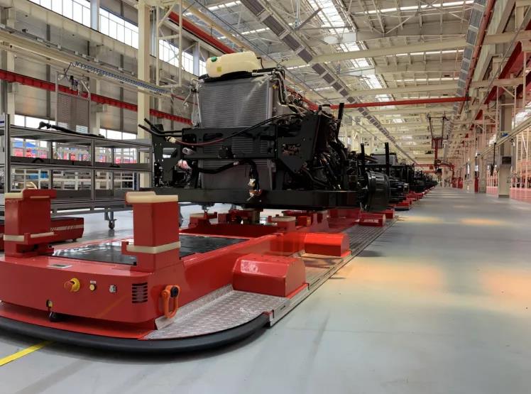 客戶為國內(nèi)某著名工程機(jī)械廠商,本項目由CSG華曉為其量身定制的91臺AGV, 主線配備43臺大型定制裝配AGV,單臺承重超過10T,可實現(xiàn)1m/min~30m/min無級變速。相比傳統(tǒng)的拖鏈裝配線來說,AGV裝配線具有路線可調(diào)整,工位可擴(kuò)展,投資更靈活的優(yōu)勢。除了主線的提升以外,物流自動化同步改善,37臺SPS的潛伏牽引AGV自動匹配主線運(yùn)行狀態(tài),按單臺份定量配貨,解放線邊庫存空間的同時又提升了裝配的準(zhǔn)確率。另外,5臺平衡懸架、前中后橋分裝頂升背負(fù)AGV,7臺發(fā)動機(jī)分裝后牽引AGV,24臺駕駛室分裝潛伏式牽引AGV,統(tǒng)籌協(xié)作實現(xiàn)全廠區(qū)內(nèi)物流轉(zhuǎn)運(yùn)的無人化。
