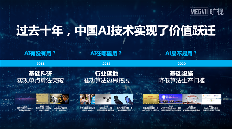 過去十年,中國AI技術發展經歷了三個階段的價值躍遷:一、基礎科研,實現單點算法突破;二、落地應用,推動算法邊界拓展;三、基礎設施,降低算法生產門檻,以解決各行各業的問題。作為一家與中國AI行業共同成長起來的企業,曠視參與了每個階段。